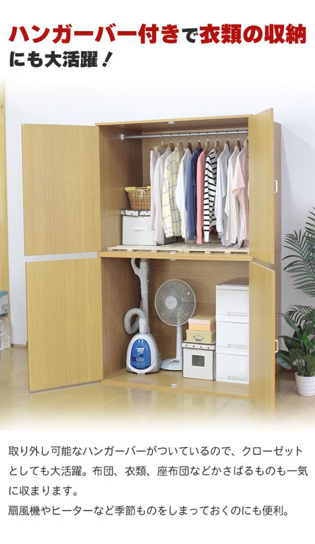 パイプハンガー付きなので、衣類も掛けて収納できます。