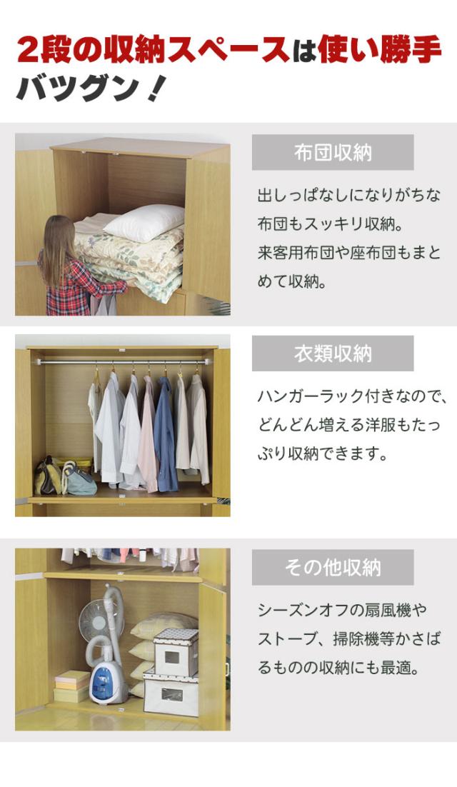 | 置き場所に困る布団や掃除機等が楽に入る、押入れ変わりの収納庫。 来客用のお布団や座布団、扇風機やストーブなどの季節商品の収納に最適です。 パイプハンガー付きなので、衣類も掛けて収納できます。 (ハンガーバーから底板までの高さは約82.5cm) |