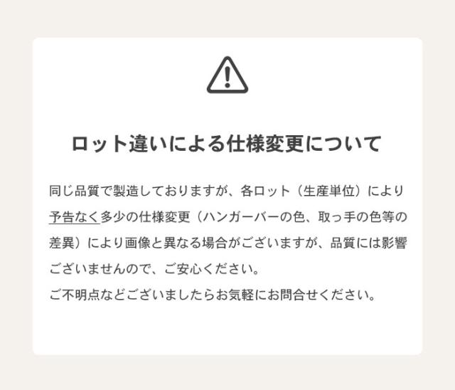 【ロット違いによる仕様変更について】 同じ品質で製造しておりますが、各ロット(生産単位)により予告なく多少の仕様変更(ハンガーバーの色、取っ手の色等の差異)により画像と異なる場合がございますが、品質には影響ございませんので、ご安心ください。
