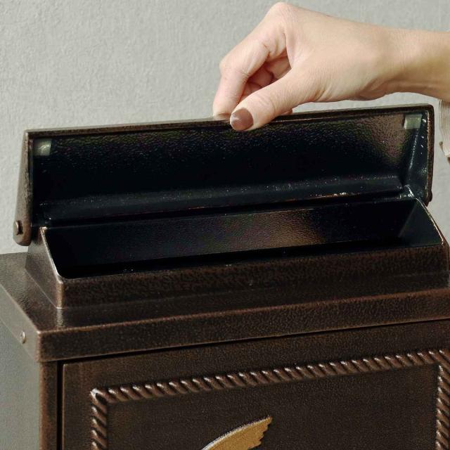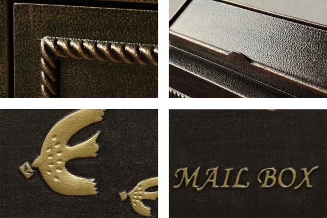 深みのあるブロンズとグリーンの2色展開の壁掛けポストです。郵便物を運ぶ小鳥の型と、"MAIL BOX"の型がデザインにアクセントを加えております。和風、洋風どちらのテイストにもマッチする落ち着いたアンティークデザインです。