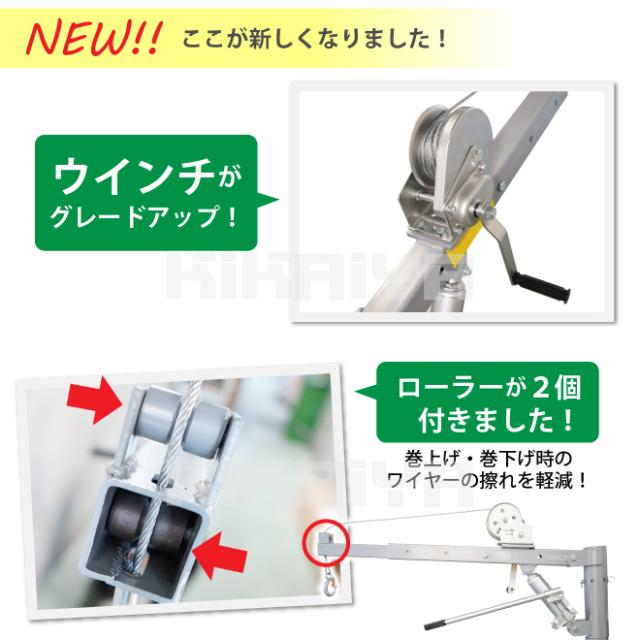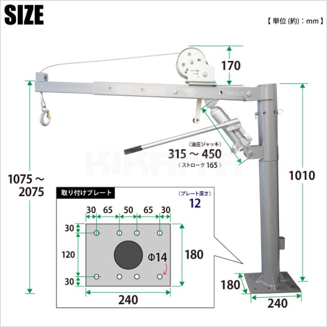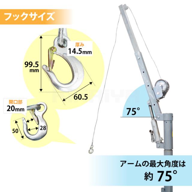 バイク・溶接機などの重量物の荷積み・荷揚げに便利! ●手動のウインチはオートブレーキ式なので巻き上げ・巻き下げどちらの場合も、ハンドルから手を離しても吊荷を保持します ●手動ウインチの巻き上げ能力は150kg程度です ●アームの高さは、油圧ジャッキで無段階に調節可能(最大高さ 約2075mm) 無負荷の状態で約37回のストロークで最大高さまで上昇します ●スイベル部は360度回転し、ピンで固定もできます ●ブームの長さは4段階(796/1005/1156/1310mm)で調節可能です ●ブームの先端2ヵ所にローラーがついており、巻上げ・巻下げ時のワイヤーの擦れを軽減します ●使わない時等は上部を外してしまっておくことができます ※ワイヤーはドラム1列分以上余巻きを確保してお使い下さい (ワイヤーの出し過ぎにご注意下さい) 【 本製品を車両に取り付けて使用する場合の注意点 】 ※車両と取り付けプレートの間に補強プレートを必ず取り付けてください ※車両の転倒等、事故が起こる可能性がありますので250kg以上の荷は吊らないでください ※250kg以下であっても取り付ける車両の安定を勘案してアウトリガーを備えるなどの対策を行ってください ※取付け専用金具・補強プレートは付属しておりません ※取付けの場合はご自身での加工が必要です ※車両に取りつけた場合は、構造変更等が必要となりますので車検の際には取り外しが必要となります |
