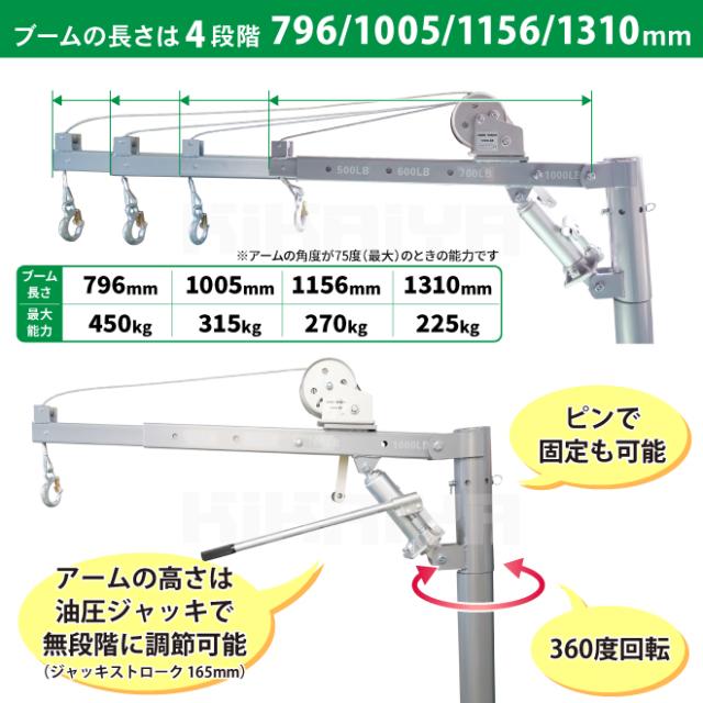 | ブーム長さ/吊上げ能力 (アーム角度75度の時) | 976mm/450kg 1005mm/315kg 1156mm/270kg 1310mm/225kg |