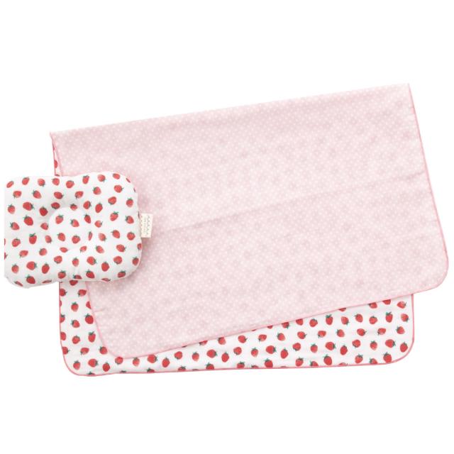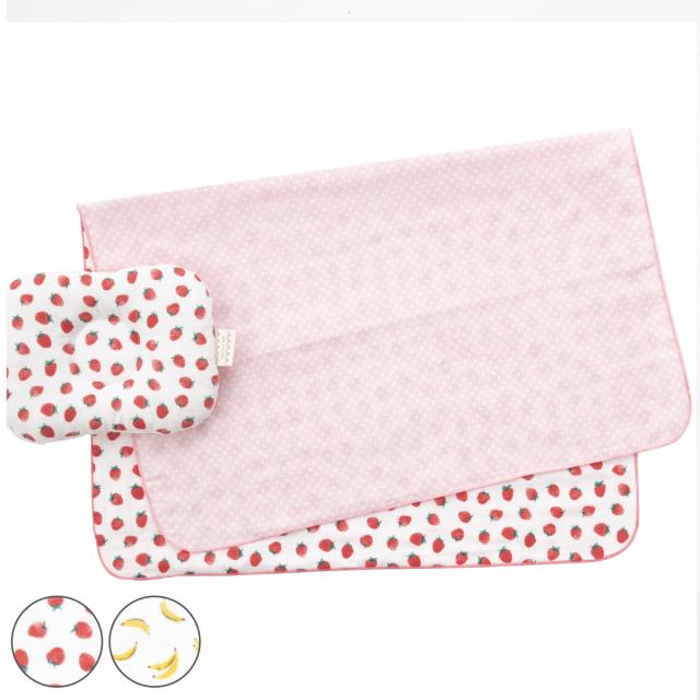 フルーツ柄のまくらとガーゼケットがかわいい、おひるねセットです。まくらの中綿以外は綿100%、日本製なので、デリケートな赤ちゃんの肌にも安心です。