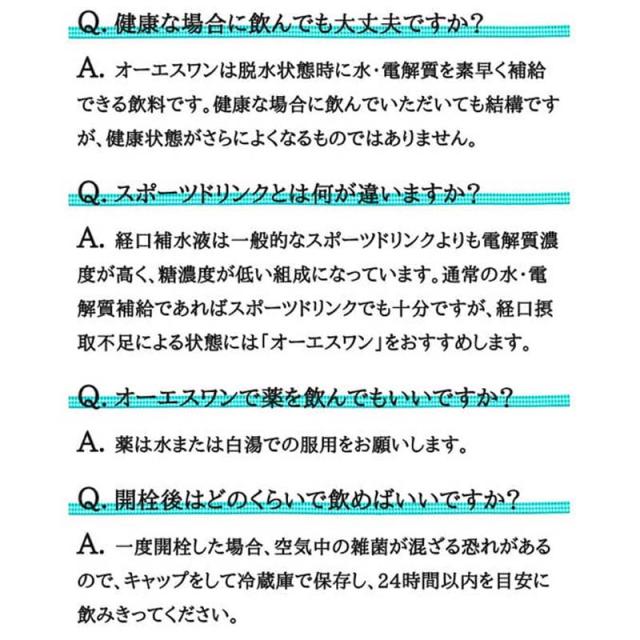 | 使用方法 | 経口補水液オーエスワンは、以下のような軽度から中等度の脱水症の時にお飲みください。 脱水症の回復後も、以下の3つの状態等における水・電解質の補給、維持にもご利用いただけます。 ○高齢者の経口摂取不足を原因とした脱水症 ○過度の発汗を原因とした脱水症 ○脱水を伴う熱中症にも |