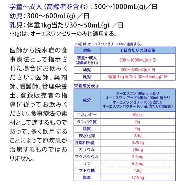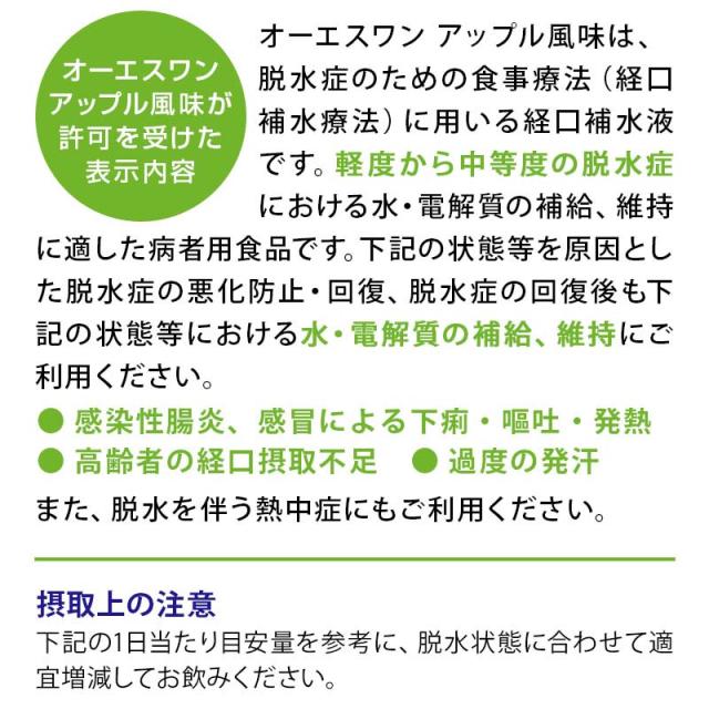 | 商品詳細 | オーエスワンは、脱水症のための食事療法(経口補水療法)に用いる経口補水液です。軽度から中等度の脱水症における水・電解質の補給、維持に適した病者用食品です。 ・オーエスワンシリーズは同じ糖・電解質濃度 ・高齢者の経口摂取不足に ・過度の発汗に ・脱水を伴う熱中症に 【味/香り】アップル風味 |