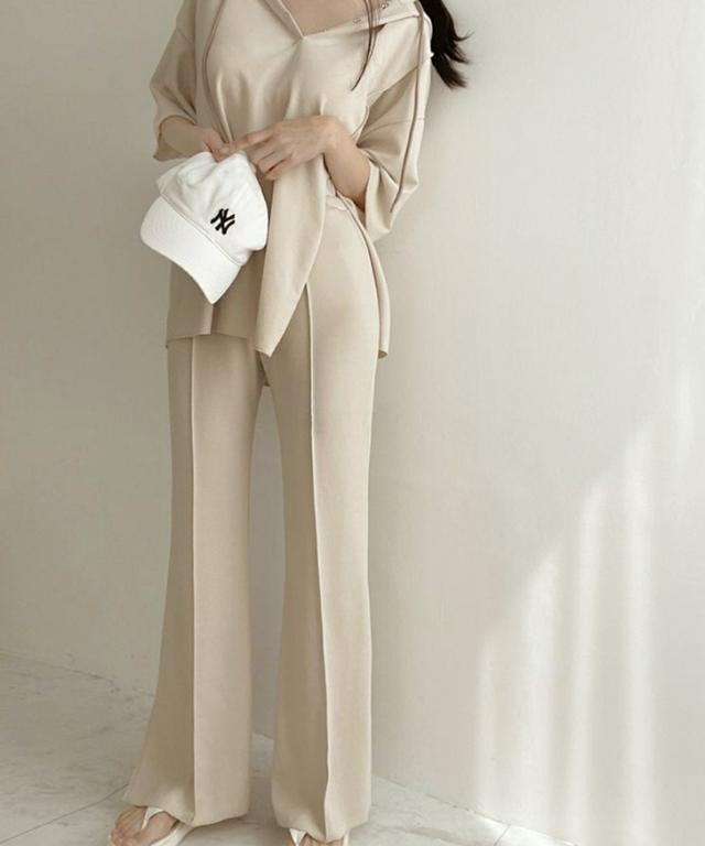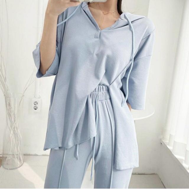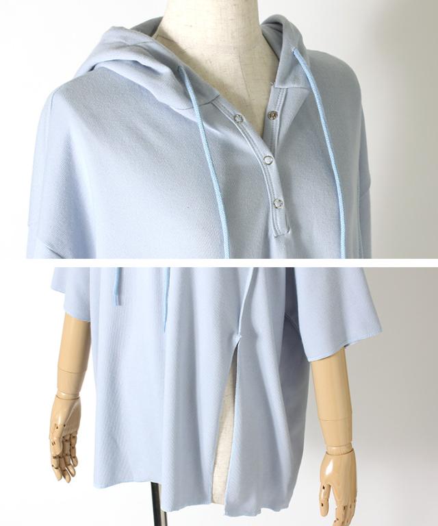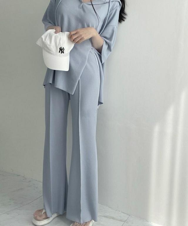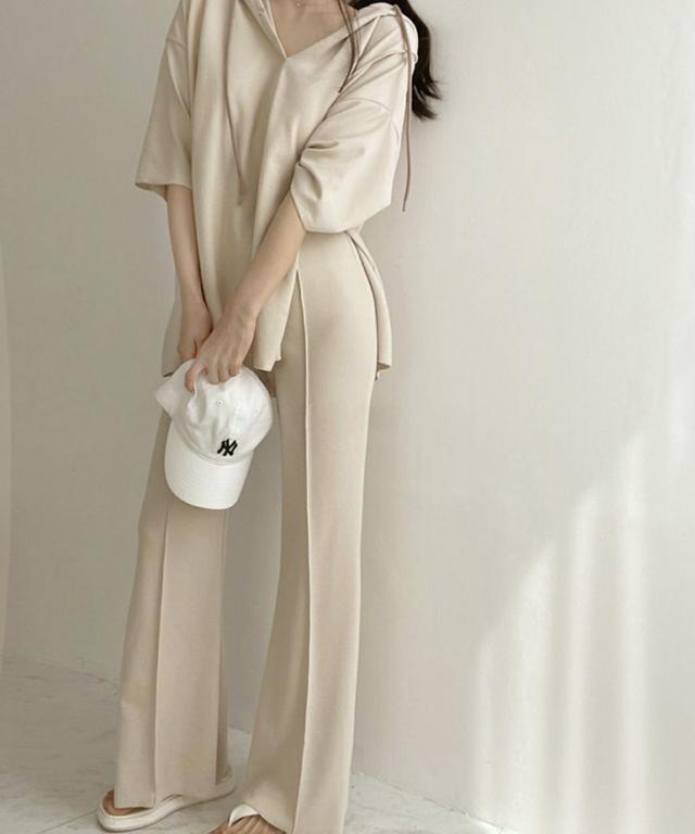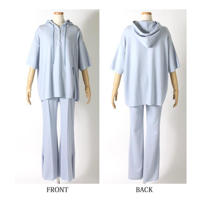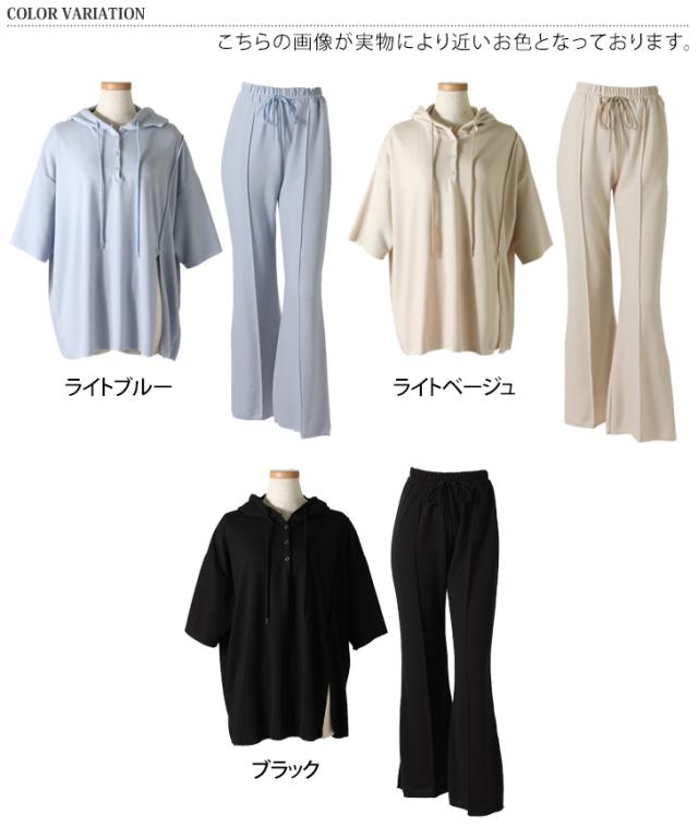 新作 ステッチスリットフーディー×センターシームセミフレアパンツセットアップ レディース トップス ボトムス 2点セット 上下セット カジュアル 半袖 5分袖 五分袖 美脚 脚長 韓国ファッション 大人 リラックス