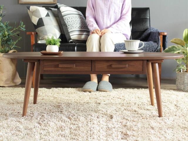 あたたかみのある木の質感に、丸くて可愛いオーバルデザインが印象的な引き出し付きローテーブルです。北欧風のナチュラルな雰囲気で、ほっと癒してくれるなごみのお部屋にしてくれます。