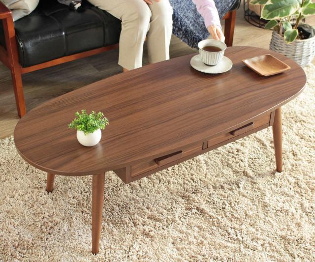 木の質感とオーバルデザインの北欧風引き出し付きローテーブル
