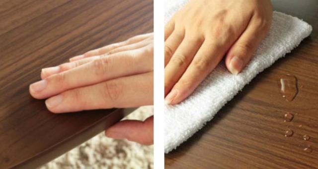 | ツルッとした手触りの天板 硬質でキズが付きにくい天板です。ツルッとした手触りで書き物にも適しています。 | サッと拭き取れお手入れ簡単 水などをこぼしても浸み込まず、サッと拭き取れるのでお手入れ楽々です。 |