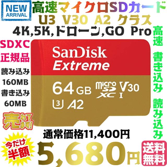 【送料無料・税込み】高速 SanDisk 64GB Extreme 正規品 マイクロSDカード ハイクオリティ U3 V30 A1 A2 クラス 64GB 読込160MB/S 書込90MB/S SDSQXA2-064G-GN6MN 並行輸入品 microSDXCカード サンディスク UHS R W スイッチ switch 動作確認済 海外リテール ドローン 防犯