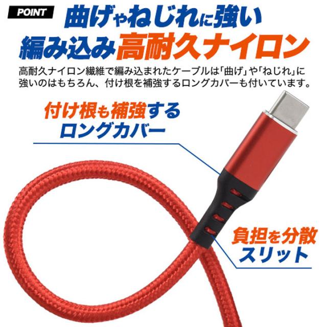 高耐久ナイロン繊維で編み込まれたケーブルは「曲げ」や「ねじれ」に強いのはもちろん、付け根を補強するロングカバーも付いています。