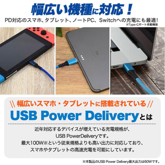 Type-C toType-Cケーブル 2m 200cm USB PD対応 60Wの超急速充電可能 充電 タイプc typec USB3.0 USB PowerDelivery レッド ピンク ブルー グレー ブラック メール便送料無料