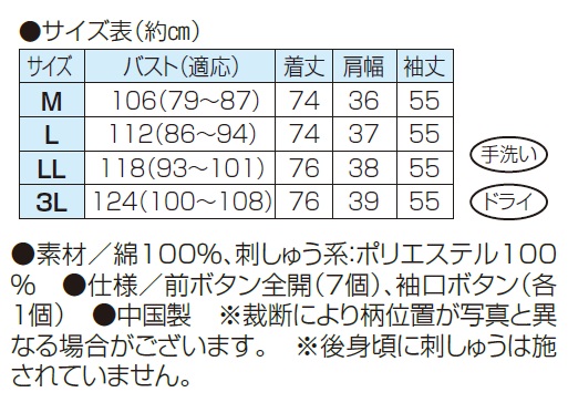 ●仕様/前ボタン全開(7個)、袖口ボタン(各1個)