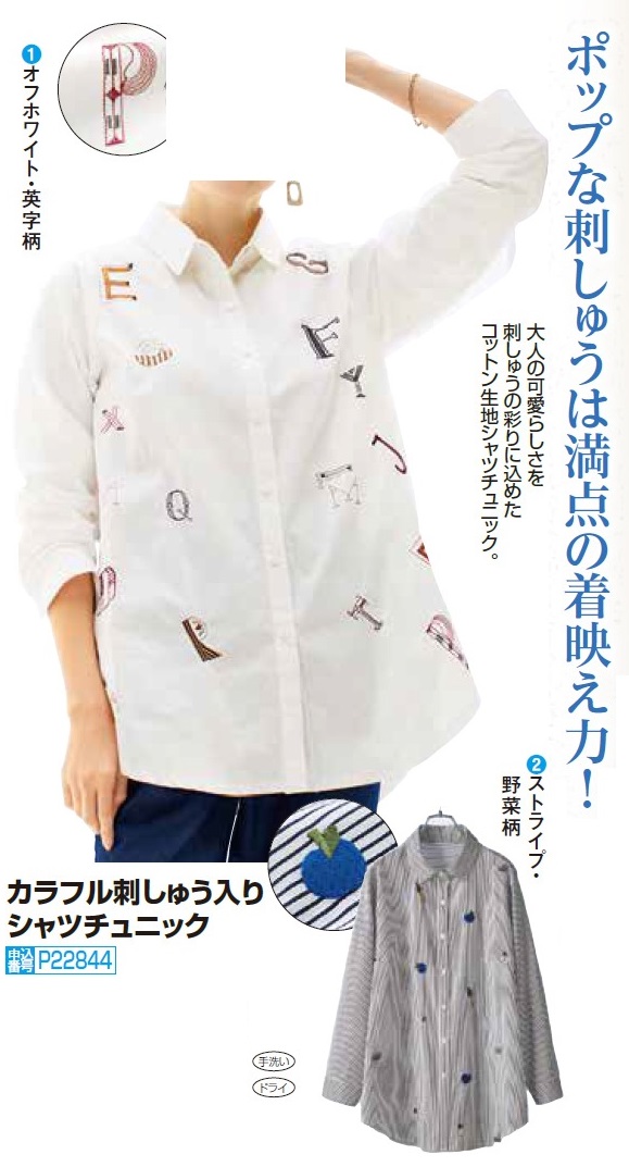長袖 シャツ コットン レディース カラフル 刺しゅう入りシャツチュニック 全2色 婦人服 ミセス シニア 女性 ホワイト 英字柄 ストライプ 野菜柄 刺繍 シニアファッション 40代 50代 60代 70代 80代 母の日 お母さん オシャレ カジュアル 春夏 nss p22844 p24334