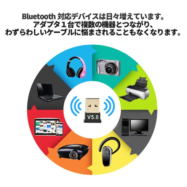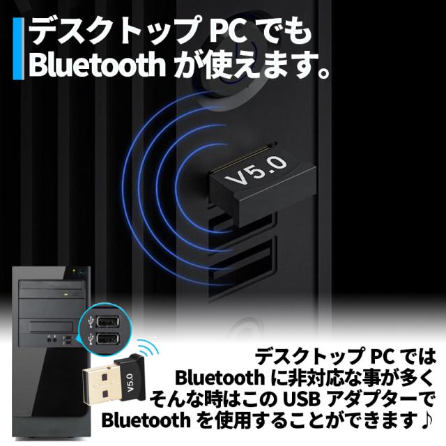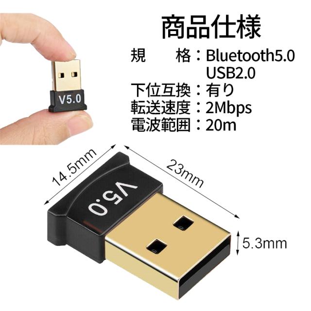 Bluetooth5.0対応Bluetoothアダプター!ドライバー不要でPCに挿すだけですぐに使えます♪デスクトップPCにはBluetoothが搭載されていないことが多く、無線のデバイスが使えません。そんなときにこのアダプターが一つあれば解決できます♪小型で持ち運びも簡単です。1台で複数のデバイスと繋がることができ、わずらわしいケーブル類に悩まされることはありません。マウス・キーボード、プリンター、スマートフォンヘッドホンやスピーカーなど様々な用途に使用できます。Bluetoothという規格は下位互換性もバッチリ使用する無線デバイスが古いBluetoothにしか対応していなくても問題なく使用できます。パッケージ内容:Bluetooth5.0アダプター x1カラー:ブラックインターフェイス:USB2.0Bluetooth対応Ver:2.0〜5.0対応OS:Windows XP以降、Mac OSX、Linux等サイズ:画像を参照※ご使用のパソコンとお手持ちのBluetoothデバイスを接続する方法は事前にご確認をお願いいたします※商品の使用により生じた如何なる損害・被害も、 弊社では一切の責任を負いかねますので予めご了承下さい※詳細は画像をご確認ください