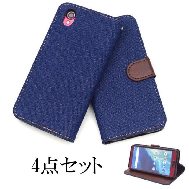 4点セット Android One X4 ケース スマホリング1点 USBケーブル 保護シート スマホカバー SH-M07 カバー 保護フィルム x4 手帳 手帳型 ケース デニム