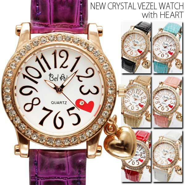 チャーム付き ベゼル 腕時計 レディース ハート ブラック ピンク レッド ミント