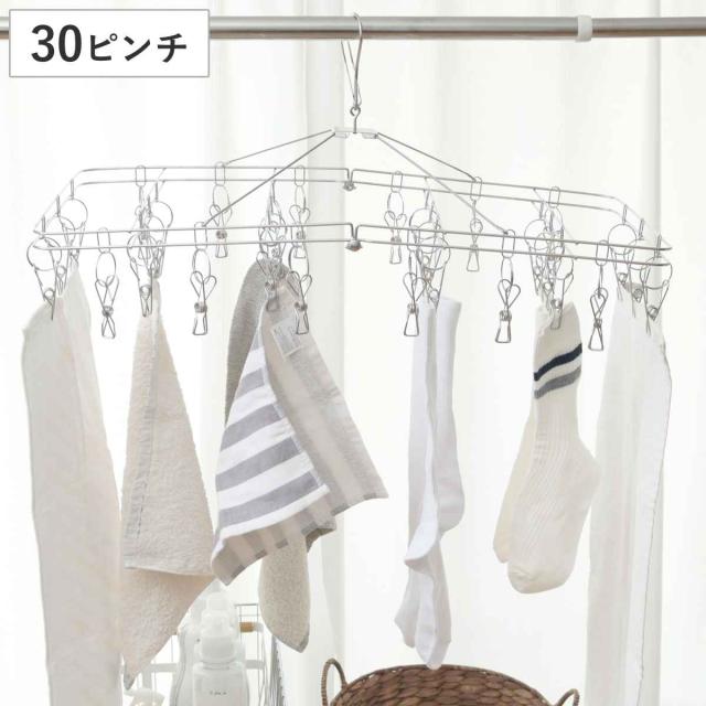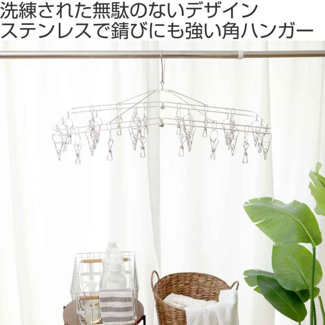 毎日たくさん洗濯をする人にオススメな丈夫で使い勝手が良い、ピンチが30個付いた角ハンガーです。丈夫で清潔なステンレス製です。サビにも強いのでベランダなど屋外で使いたい方にぴったりです。