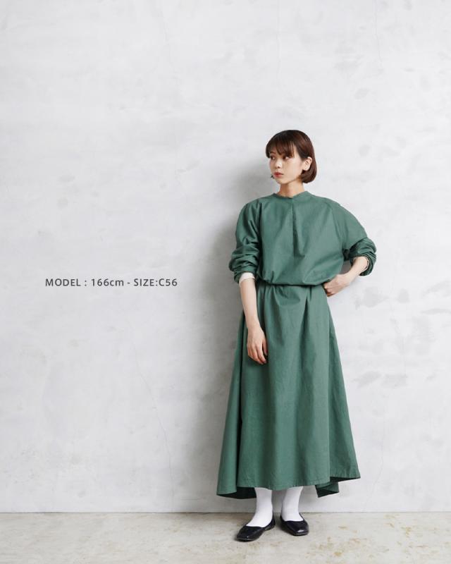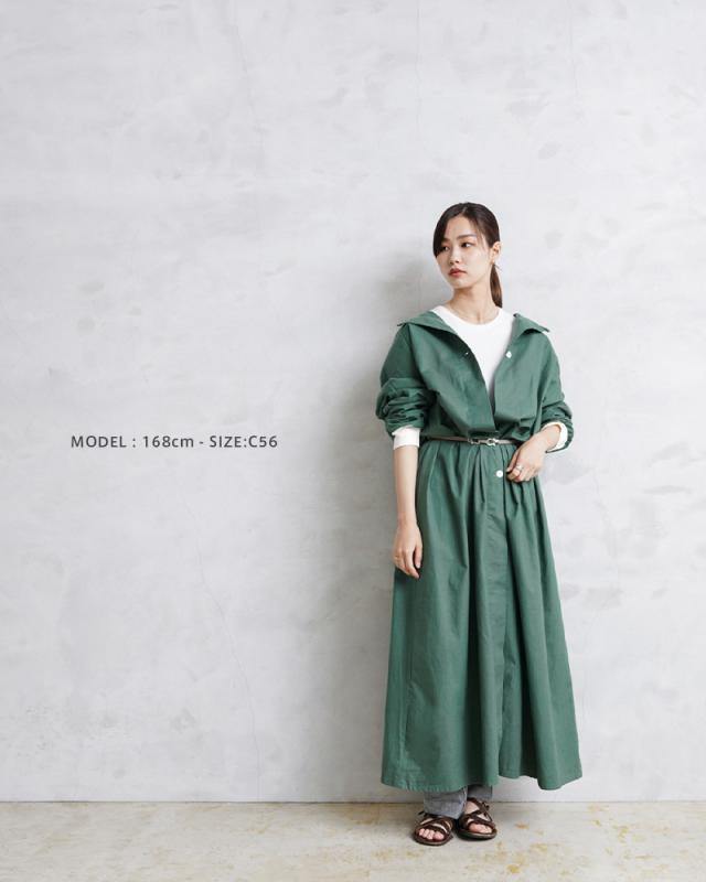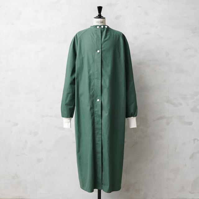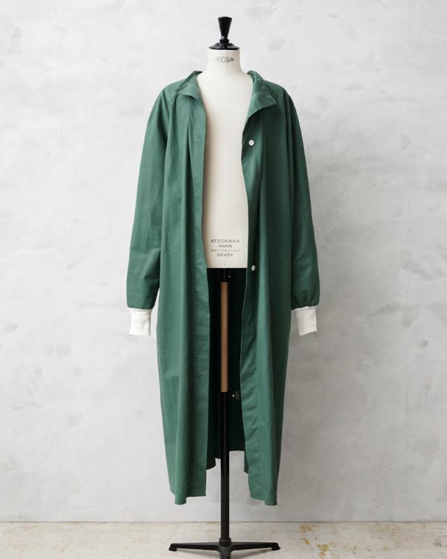 スウェーデン軍で医療用として使用されていたオペレーションコートで、外科用のガウンとして本来は後ろでボタンを留めて着用されていたようですが、着丈が長くゆったりとしたシルエットですのでその着丈の長さを活かし、前後どちらでも着用可能な仕様となっています。シャツ感覚で着用していただくのもおすすめです。淡いブルーグリーン系のさらっとした肌触りのコットンが使用されており、袖口のオフホワイトのリブとボタンがデザインのアクセントになっています。女性にも男性にも着用していただけるデザインですので、女性でもウエストにベルトなどを巻いていただくことで丈感の調節をしながらシルエットにメリハリを付けることができます。