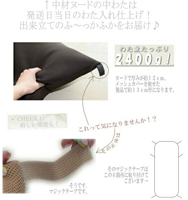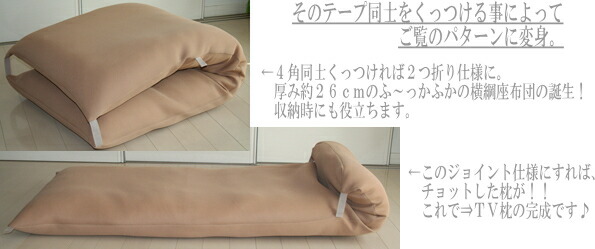 さらに周囲6ヵ所のマジックテープを利用して2つ折りにしたりちょっとしたテレビ枕にしたり…変形させながら快適にお使いいただけます。