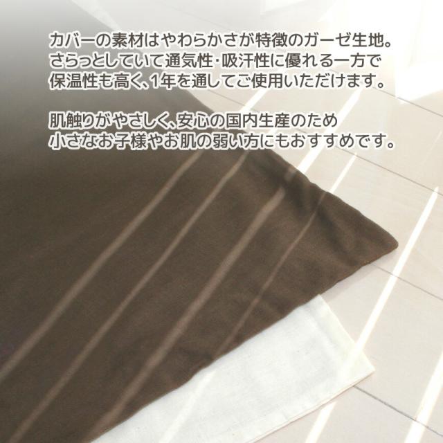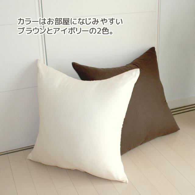 通気性・吸汗性に優れた2枚重ねガーゼ素材の70×70cmサイズカバーにポリエステルわた仕様の中材クッションを入れました。