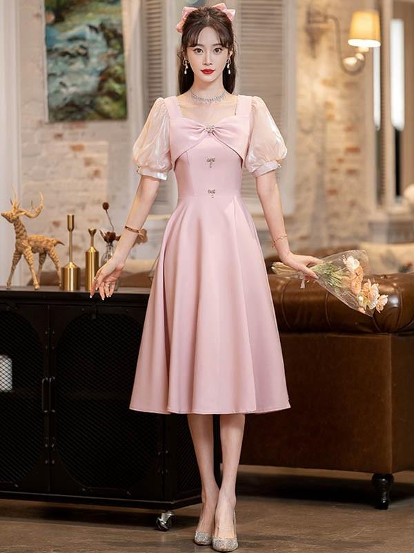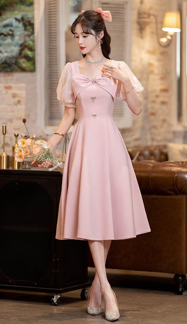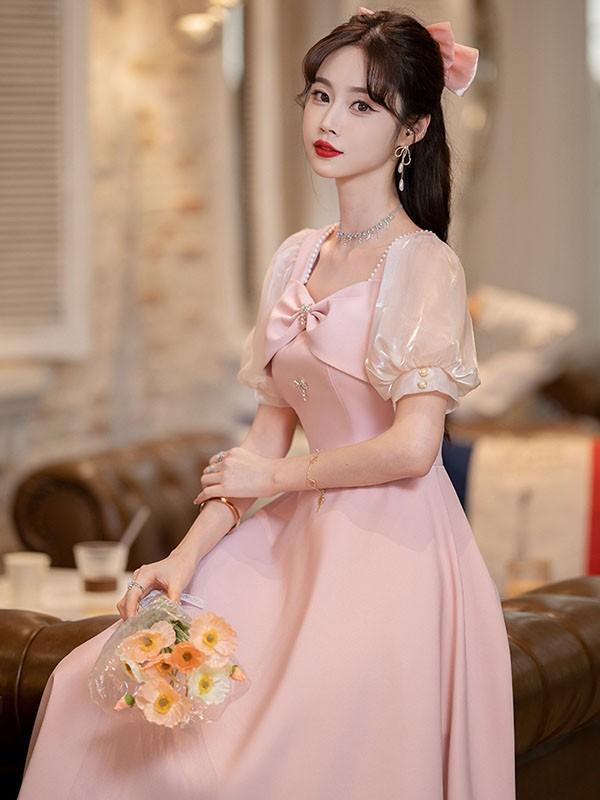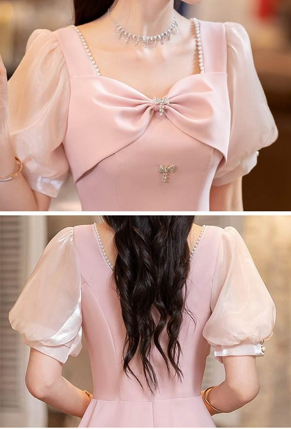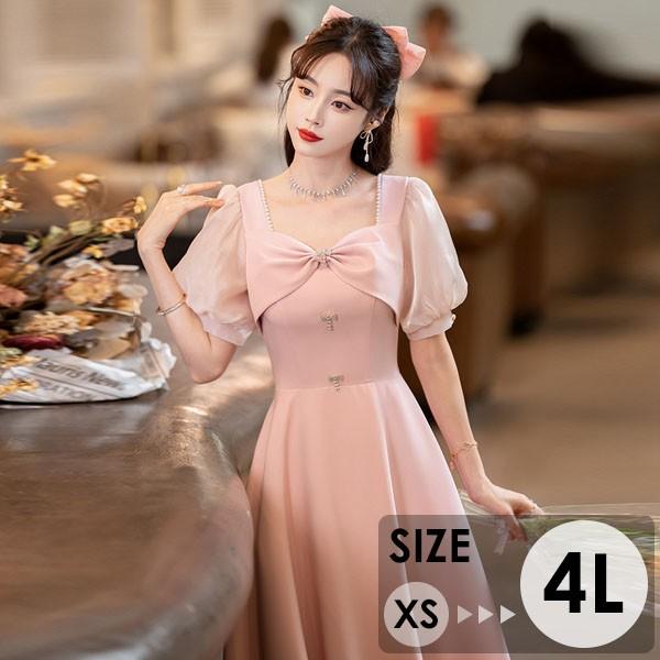 ビッグリボン スクエアネック パフスリーブ ミモレ丈ドレス 演奏会 大人 ピアノ 発表会 ピンク ワンピース 袖付き ドレス 半袖 成人式 同窓会 演奏会ドレス Aライン 結婚式 ステージドレス 二次会 花嫁 母親 パーティードレス ウエディング ハワイ 結婚式 リゾートワンピ da176n1n1la