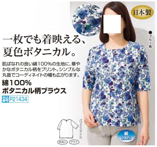 ブラウス コットン レディース ブルー系 丸首 五分袖 日本製 綿100% ボタニカル柄ブラウス 婦人服 ミセス シニア 女性 花柄 クルーネック 上品 華やか シニアファッション 40代 50代 60代 70代 80代 母の日 お母さん 春夏 fuji p21434