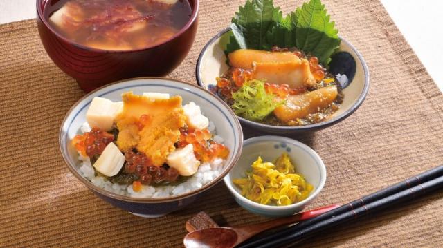 とろみ昆布(昆布(北海道産)、しょうゆ、還元水飴、発酵調味料、砂糖、醸造酢、食塩、ゼラチン)(国内製造)、煮ほたて(ほたて(国産)、清酒、食塩)、いくら醤油漬(いくら(国産)、しょうゆ、砂糖、清酒、醸造酢)、うに、煮あわび(あわび、清酒、食塩)/調味料(アミノ酸等)、酒精、ソルビット、増粘多糖類、カラメル色素、甘味料(カンゾウ)、(一部に小麦・あわび・いくら・大豆・ゼラチンを含む)