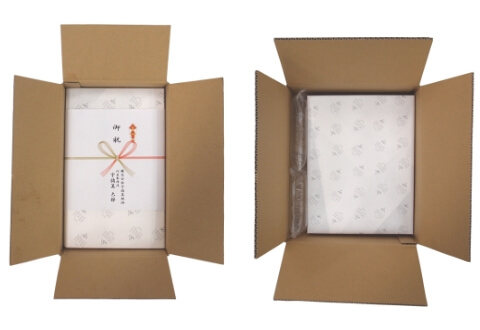 メーカー指定のオリジナル包装紙でお包みし、段ボール箱へ入れてお届けします。