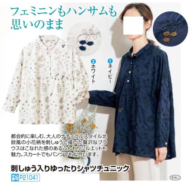 長袖 ブラウス チュニック レディース 刺しゅう入りゆったりシャツチュニック(全2色) 婦人服 ミセス シニア 女性 ネイビー ホワイト 白 紺色 シニアファッション 40代 50代 60代 70代 80代 小さい襟 かわいい ナチュラル ギフト プレゼント 母の日 おしゃれ nss p21041