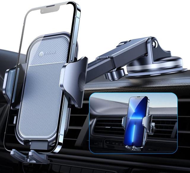 【安定性アップ!スマホを全面保護】スマホ自体のホールド感を向上させるために、Andobilの2022年最新型の車載ホルダーは業界初に滑り止め加工を施したシリコン表面を採用し、スマホを取り付ける時でも、取り外す時でも、車が振動した時でも、スマホを傷付きから守ります。また、サイド固定と下側固定もクッション材料を使用して、耐震性が良くて普通の車載ホルダーよりしっかりとスマホをホールドします。そして、側面のボタンで取り付けや取り外しが簡単に出来るワンタッチ式タイプの車載ホルダーです。ボタンを押すと、わずか0.1秒でスマホを挟むためのアームが自動に開きます。再度ボタンを押さない限り勝手に開くことはなく、利便性と実用性を両立させます。