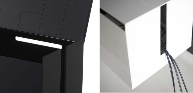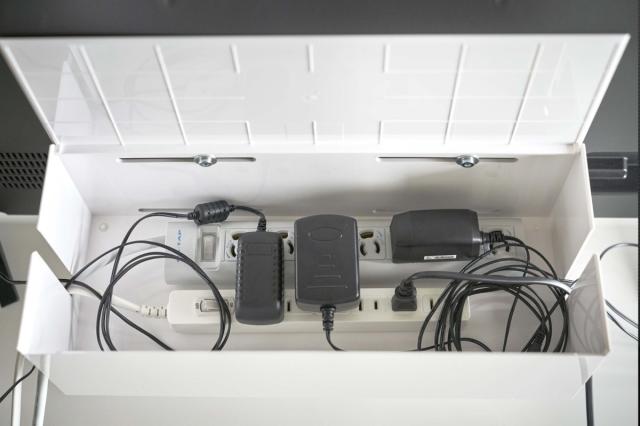 正面に配線口があり、蓋の上で携帯電話などのデジタル機器も充電しやすい構造です。デスクやテレビボードの上に置いての使用も可能なので、デスク周りの配線整理にもぴったりです。