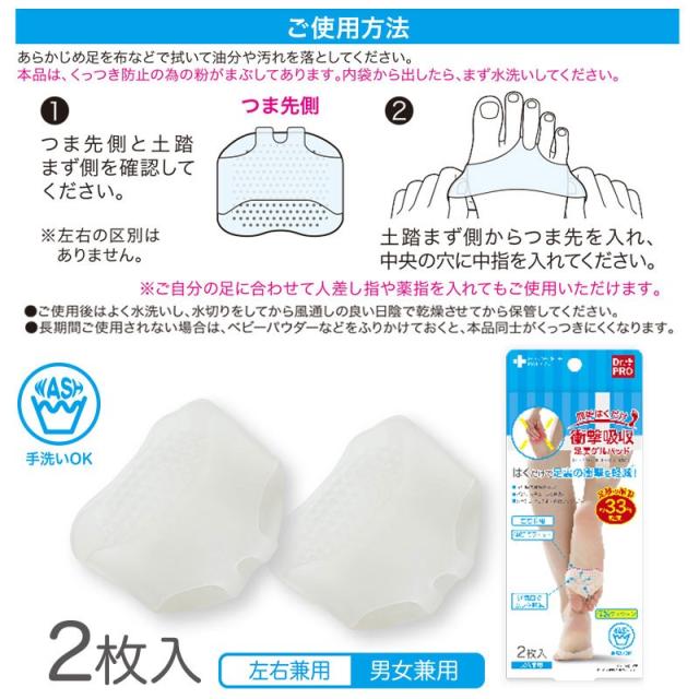 | ご使用方法 | 【ご使用方法】 (はじめに)あらかじめ足を布などで拭いて油分や汚れを落としてください。本品は、くっつき防止の為の粉がまぶしてあります。内袋から出したら、まず水洗いしてください。 1.つま先側と土踏まず側を確認してください。 ※左右の区別はありません。 2.土踏まず側からつま先を入れ、中央の穴に中指を入れてください。 ※ご自分の足に合わせて人差し指や薬指を入れてもご使用いただけます。 【お手入れ方法】 ●ご使用後はよく水洗いし、水切りをしてから風通しの良い日陰で乾燥させてから保管してください。●長期間ご使用されない場合は、ベビーパウダーなどをふりかけておくと、本品同士がくっつきにくくなります。 |