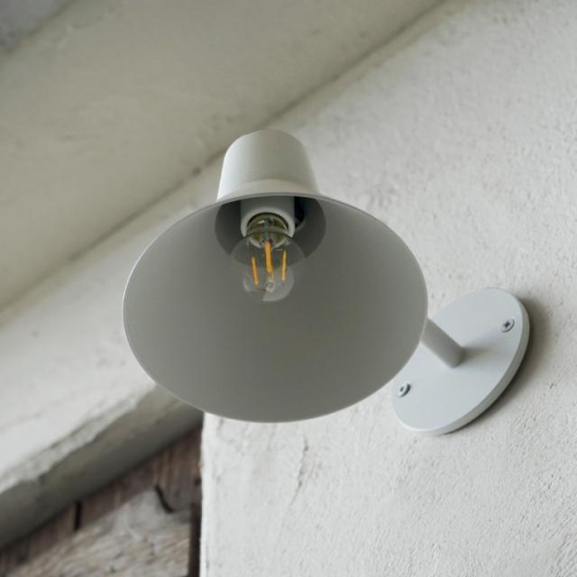 現代にアレンジしたようなデザインで、建物外観のポイントとなる存在です。アームが伸びた先にシェードがあるため、下方向を中心にあかりが広がります。