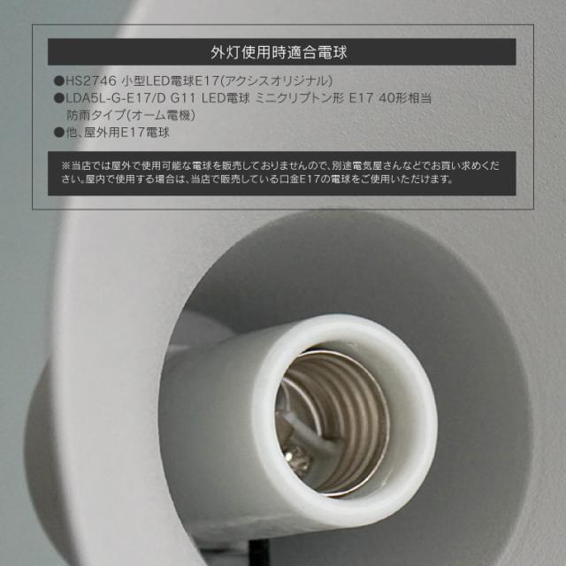 | 仕様 | 口金:E17用 定格電圧:100V 対応電球:LED電球・白熱電球 ※電球は付属しません。 【外灯使用時適合電球】 ●HS2746 小型LED電球E17(アクシスオリジナル) ●LDA5L-G-E17/D G11 LED電球 ミニクリプトン形 E17 40形相当 防雨タイプ(オーム電機) ●他、屋外用E17電球 |