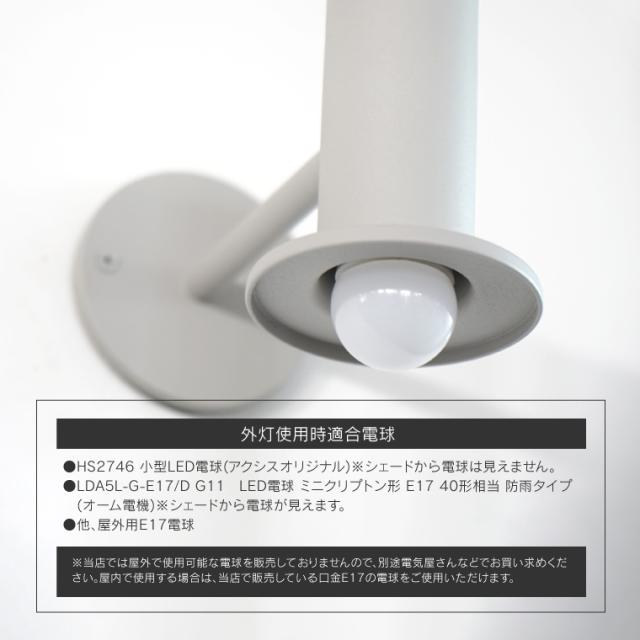 | 仕様 | 口金:E17用 定格電圧:100V 対応電球:LED電球・白熱電球 ※エントランスライトのみの価格です。(電球は付属しません。) 【外灯使用時適合電球】 ●HS2746 小型LED電球(アクシスオリジナル) ●LDA5L-G-E17/D G11 LED電球 ミニクリプトン形 E17 40形相当 防雨タイプ(オーム電機) ●他、屋外用E17電球 |