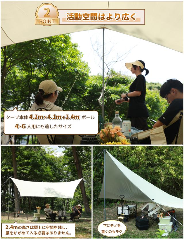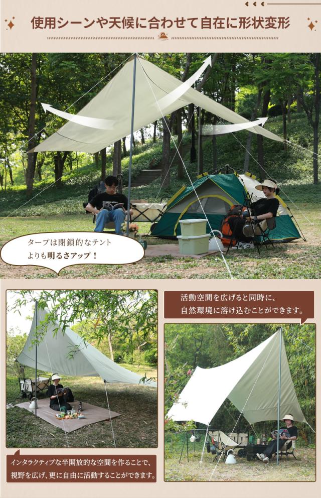 ★使用シーンや天候に合わせて自在に形状変形。タープは閉鎖的なテントよりも明るさアップ!!