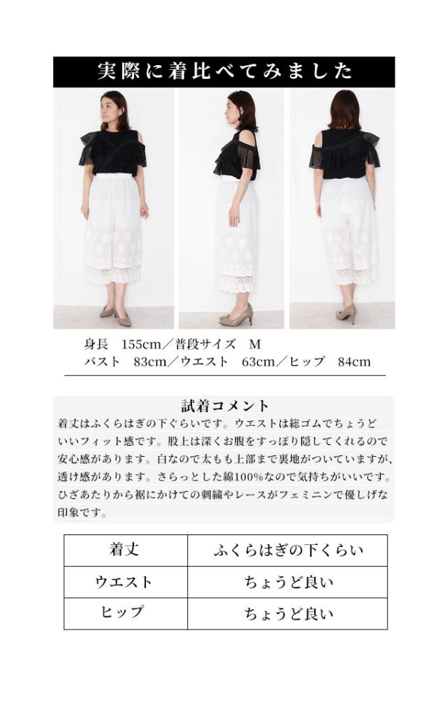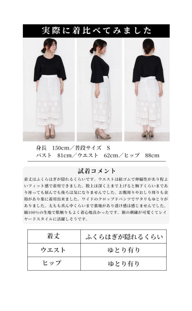 着丈はふくらはぎが隠れるくらいです。ウエストは総ゴムで伸縮性があり程よいフィット感で着用できました。股上は深く上まで上げると胸下くらいまであり座っても屈んでも後ろは気になりませんでした。お腹周りやおしり周りも余裕があり楽に着用出来ました。ワイドのクロップドパンツでワタリもゆとりがありました。太もも真ん中くらいまで裏地があり透け感は感じませんでした。綿100%の生地で肌触りもよく着心地良かったです。裾の刺繍が可愛くてレイヤードスタイルに活躍しそうです。