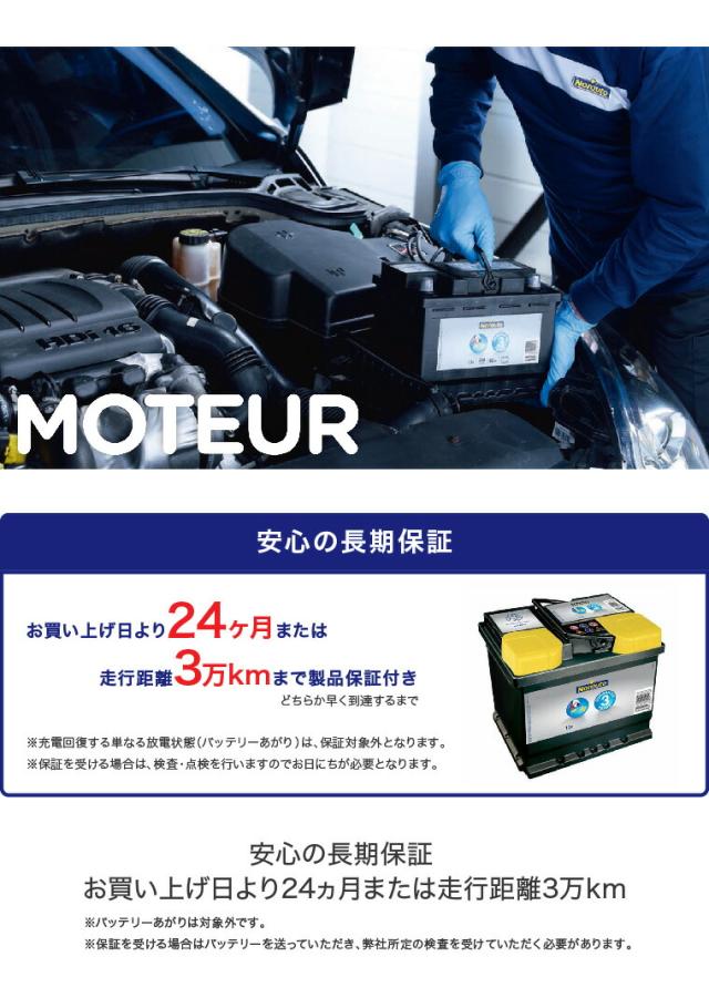 24ヶ月または走行距離3万Kmの製品保証が付いておりますが、放電状態(バッテリーあがり)は保証対象外となります。ノルオートAGMバッテ