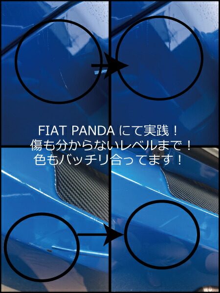 スタッフAが愛車のフィアットパンダに早速使ってみました。所詮シロウトなのでそんなに綺麗には塗れませんが、下地が見えちゃっているよりは全然いい!遠目で見たらぱっと見、傷が分からないレベルです。色はバッチリ合ってます。