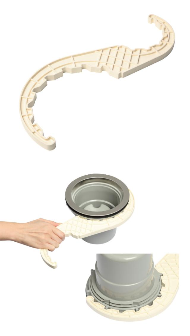 流し台排水トラップ用の締め付け工具です。配管部品の接続部をしっかりと締められます。水漏れの心配を解消して、水まわりを安心・清潔に。
