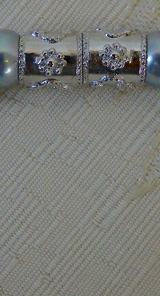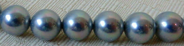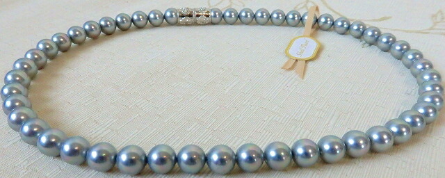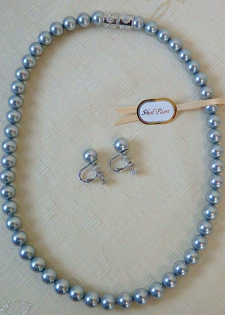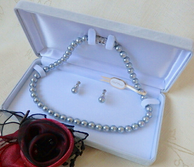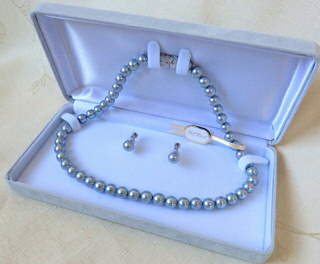 ↓美しいグレーの8ミリ玉の美しく輝く、「みがき仕様」貝パールネックレスとイヤリングのセット。