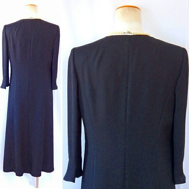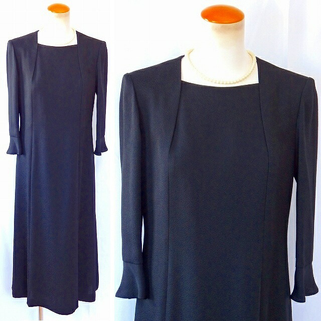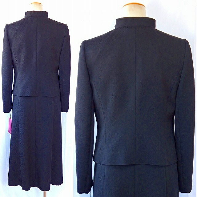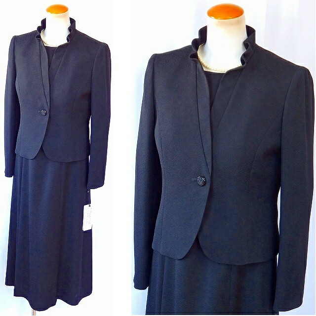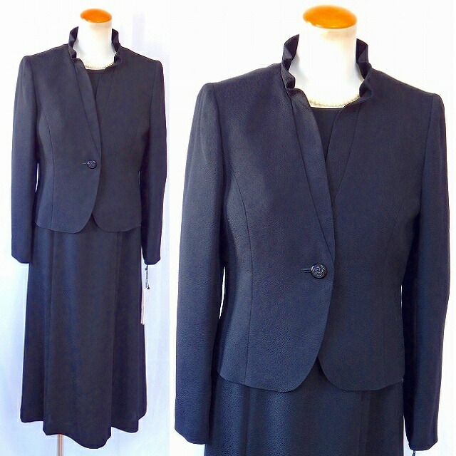 | 最高品質の米沢織生地を使用した、 人気のスタンドフリル衿ジャケットと、 シルエットの美しさが特徴の 機能的な前ファスナーワンピースの、 アランシアクチュールの日本製アンサンブル。 体になじむ美しいシルエットが特徴の、 オールシーズン対応の、 ブラックフォーマルです。 |