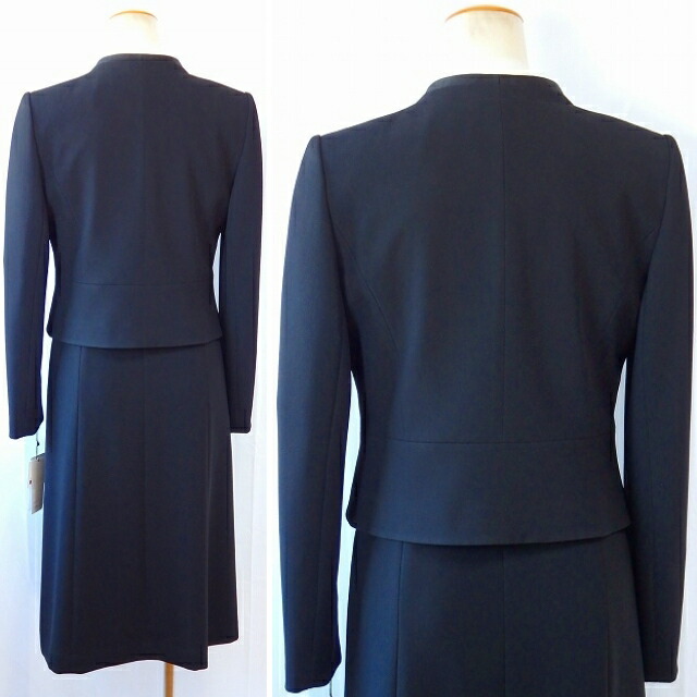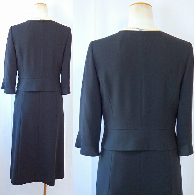| サテンを縁取ったシンプルノーカラー衿と、 ウエストタックで動きをプラスしたアンサンブル。 ウエスト中央のカットビーズが程よいアクセント。 体になじむ美しいシルエットが特徴の、 オールシーズン対応の、 ブラックフォーマルです。 |