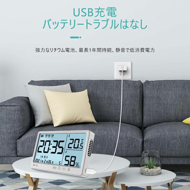 デジタル湿度計 デジタル時計 温度計 室内室外 USB充電式温湿度計 LCD スタンド 壁掛け 探知機 監視機 湿度計付き ミニ測定温度 クロック付き