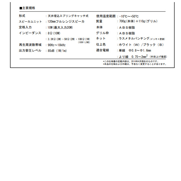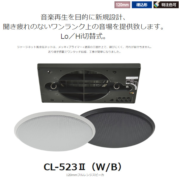 ※本商品は掲載画像右のブラック1台の販売となります。 ※納品時に、2台1セットと箱に記載があるケースがございますが、1台単位で販売している商品です。ご注意下さい。 音楽再生を目的に新規設計、 聞き疲れのないワンランク上の音場を提供致します。 Lo/Hi切替式。 ジャージネット風金属ネットは、メッキ+プライマー+塗装の三層仕上で、錆びにくく、汚れが目立ちません。 送り端子搭載でワンタッチ結線、工事が簡単になりました。 ■スピーカ:120mmフルレンジスピーカ ■公称インピーダンス:8Ω(10W)/3.3kΩ(3W)・5KΩ(2W)・10kΩ(1W) ■外形寸法 (W×H×D):本体:215×134×71.5mm グリル:180(直径)×8.8(D)mm ■質量:質量 700g(本体)+110g(グリル) ■最適設置ポジション:店舗、リラクゼーションスペースなど。 ※設置工事につきましては、お客様ご自身で設置業者様にご依頼下さい。 ※記載は商品仕様の一部です。仕様説明不足等の理由での返品はできません。特に適合等は必ずご確認ください。