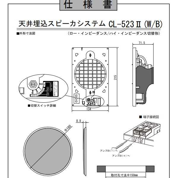 | 公称インピーダンス | 8Ω(10W)/3.3kΩ(3W)・5KΩ(2W)・10kΩ(1W) |