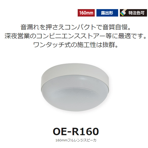 音漏れを押さえコンパクトで音質自慢。 深夜営業のコンビニエンスストアー等に最適です。 ワンタッチ式の施工性は抜群。 ■スピーカ:160mmフルレンジスピーカ ■外形寸法 (W×H×D):φ230×89(D)mm ■質量:OE-R160:760g / OE-R160/H:870g /OE-R160/HAT:890g ■付属品:ブラケット、取付ネジ、取扱説明書 ■最適設置ポジション:コンビニエンスストア・24hスーパー・レンタルビデオ店など、階上が住宅の店舗、施設。 ※設置工事につきましては、お客様ご自身で設置業者様にご依頼下さい。 ※記載は商品仕様の一部です。仕様説明不足等の理由での返品はできません。特に適合等は必ずご確認ください。