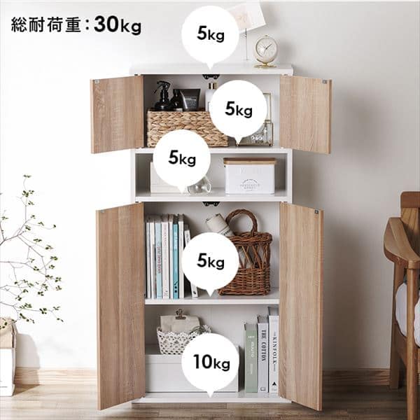 天板/5kg、固定棚板(上)/5kg、固定棚板(下)/5kg、可動棚板/5kg、底板/10kg、全体/30kg