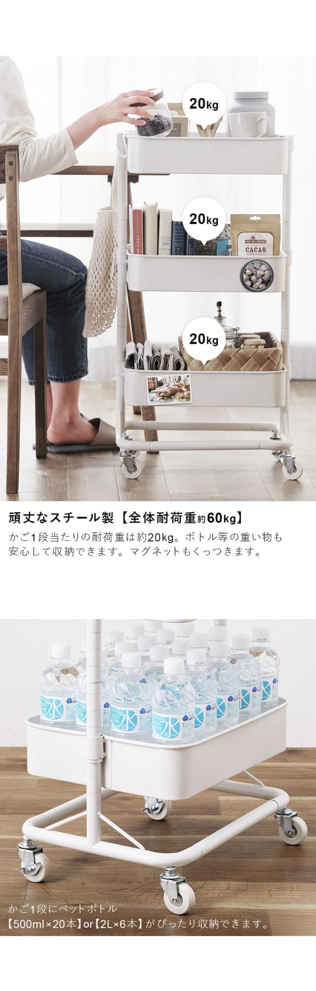 1段当たりの耐荷重は約20kgあるので、ボトルなどの重たい物もOKです。